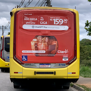 Adesivo aplicado na traseira total do ônibus. A mídia OOH com 3 X mais visualização do que o busdoor. Seu outdoor em movimento.